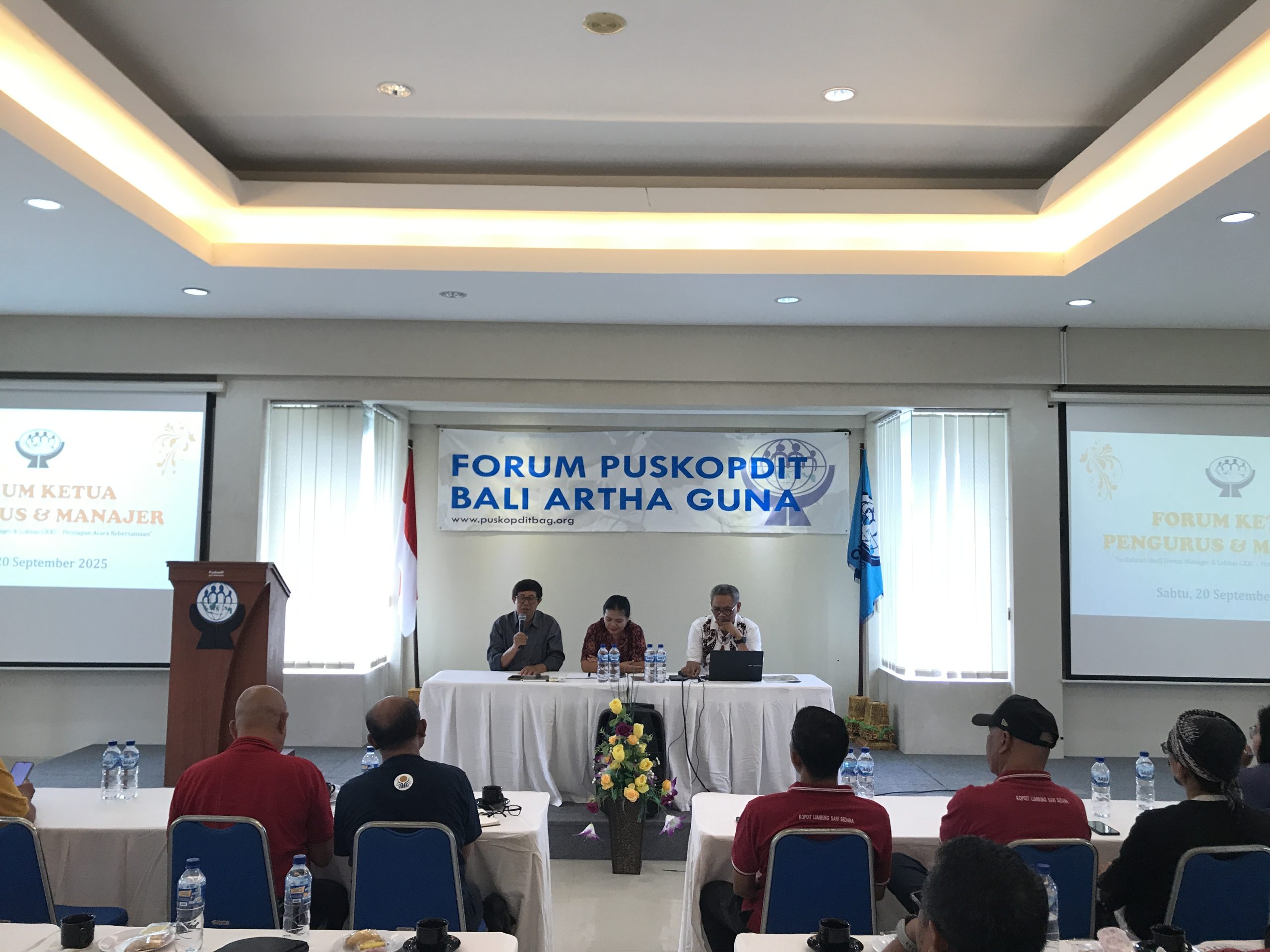 Puskopdit Bali Artha Guna melaksanakan Forum Ketua Pengurus dan Manajer pada hari Sabtu (20/09) di Ruang Pertemuan Lt. III Kantor Puskopdit Bali Artha Guna. Forum ini dihadiri oleh 31 peserta dari 15 koperasi primer anggota. Acara dimulai pukul 10.10 Wita yang diawali dengan doa selanjutnya dibuka secara resmi dengan sambutan oleh Jemi Hermanus Piri selaku Wakil Ketua Pengurus Puskopdit Bali Artha Guna.