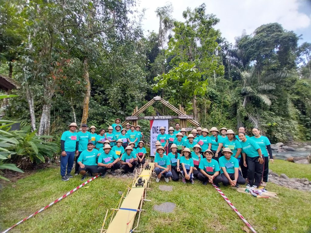 Mulai dari ice breaking, kemudian dilaksanakan beragam permainan. Pada pos 1 dilaksanakan permainan Komunikasi Lego. Kelompok Kuning sebagai pemenang berangkat trekking pertama dilanjutkan kelompok pemenang berikutnya yaitu kelompok Hijau, Merah, Biru dan Ungu. Trekking ini mengambil jalur keluar dari areal Mulia Agro, yang mana terdapat 5 pos dengan tantangan yang berbeda. Pada pos 2 dilaksanakan permainan “Labirin Bergoyang” yang berada di jalur pintu masuk Mulia Agro. Kelompok peserta selanjutnya berjalan mengikuti jalan setapak yang sudah dipasang penunjuk arah, hingga tiba di pos 3 areal sawah. Pada pos 3 ini dilaksanakan permainan “Ember Terbang” selanjutnya berjalan lagi di sepanjang pematang sawah hingga tepi jalan menemukan pos 4.