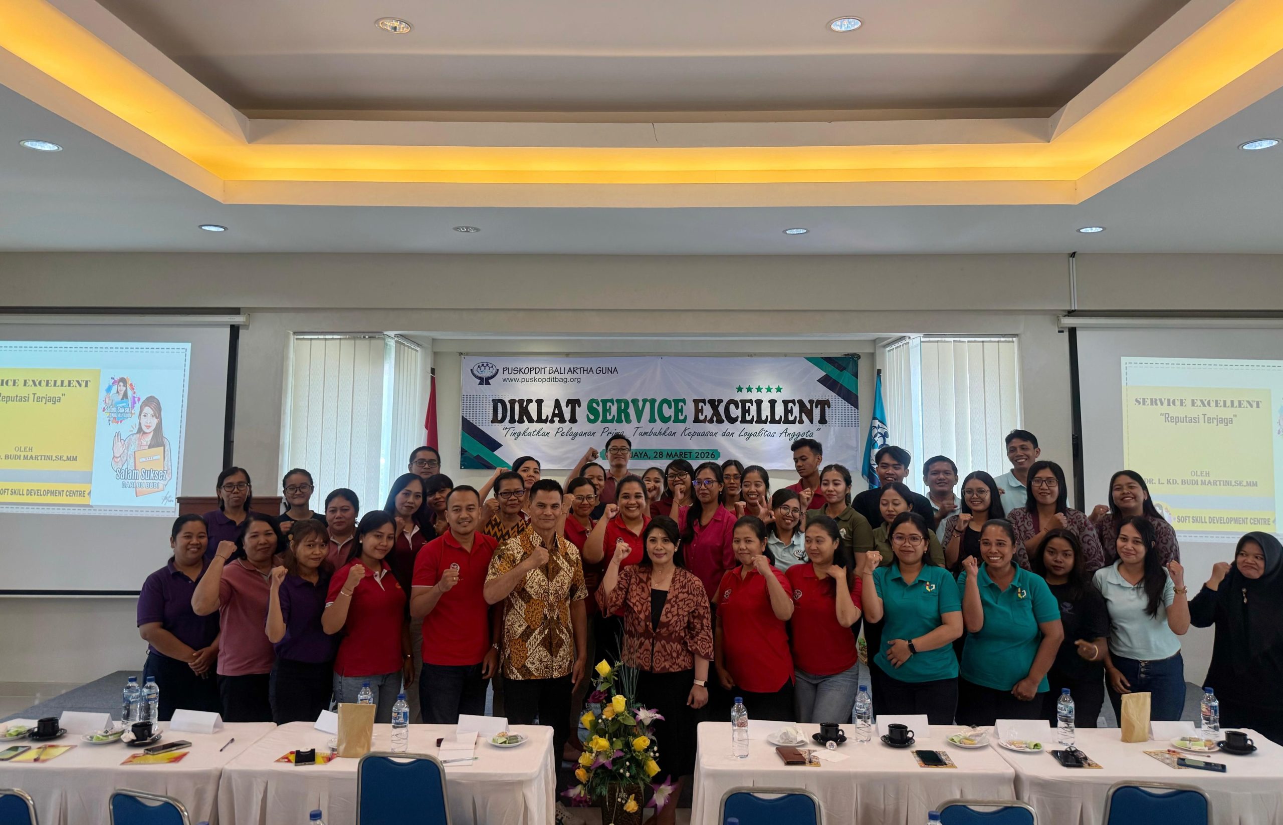Menyikapi hal tersebut, maka Puskopdit Bali Artha Guna mengadakan “Diklat Service Excellent” tanggal 28 Maret 2026 di Ruang Diklat Lt. III Kantor Puskopdit Bali Artha Guna. Pelatihan ini dihadiri oleh 39 peserta dari 14 koperasi primer anggota. Acara dimulai pukul 08.45 Wita yang diawali dengan doa selanjutnya dibuka secara resmi dengan sambutan oleh Jemi Hermanus Piri selaku Wakil Ketua Pengurus Puskopdit Bali Artha Guna. Adapun hadir narasumber pelatihan ini adalah Ibu Dr. Luh Kadek Budi Martini, SE.,MM. serta didampingi oleh 3 orang Tim Soft Skill Development Centre (SSDC). Beliau merupakan founder Tim SSDC dan juga aktif sebagai dosen di salah satu perguruan tinggi di Bali.