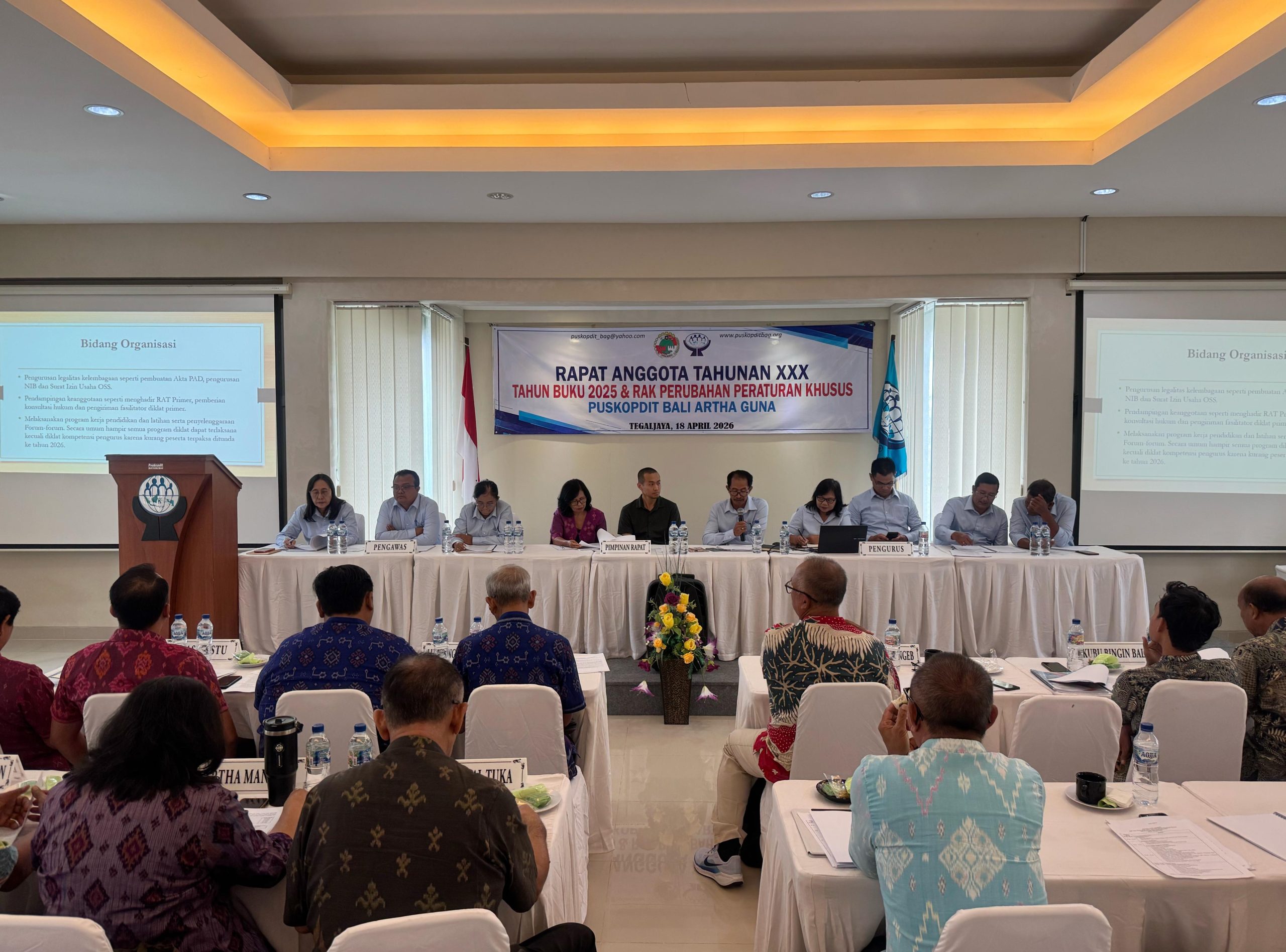 Sabtu (18/04) pukul 09.40 Wita, Puskopdit Bali Artha Guna menyelenggarakan Rapat Anggota Tahunan (RAT) XXX Tahun Buku 2025 dan Rapat Anggota Khusus (RAK) Perubahan Peraturan Khusus di Aula Kantor Puskopdit Bali Artha Guna, Jl. Mudutaki IV Banjar Tegaljaya, Dalung, Kuta Utara, Badung. RAT dihadiri oleh 48 peserta yang terdiri atas 17 primer anggota, segenap Kepengurusan dan perwakilan Manajemen Puskopdit Bali Artha Guna serta undangan dari Induk Koperasi Kredit (Inkopdit) dan Dinas Koperasi Usaha Kecil dan Menengah Provinsi Bali.